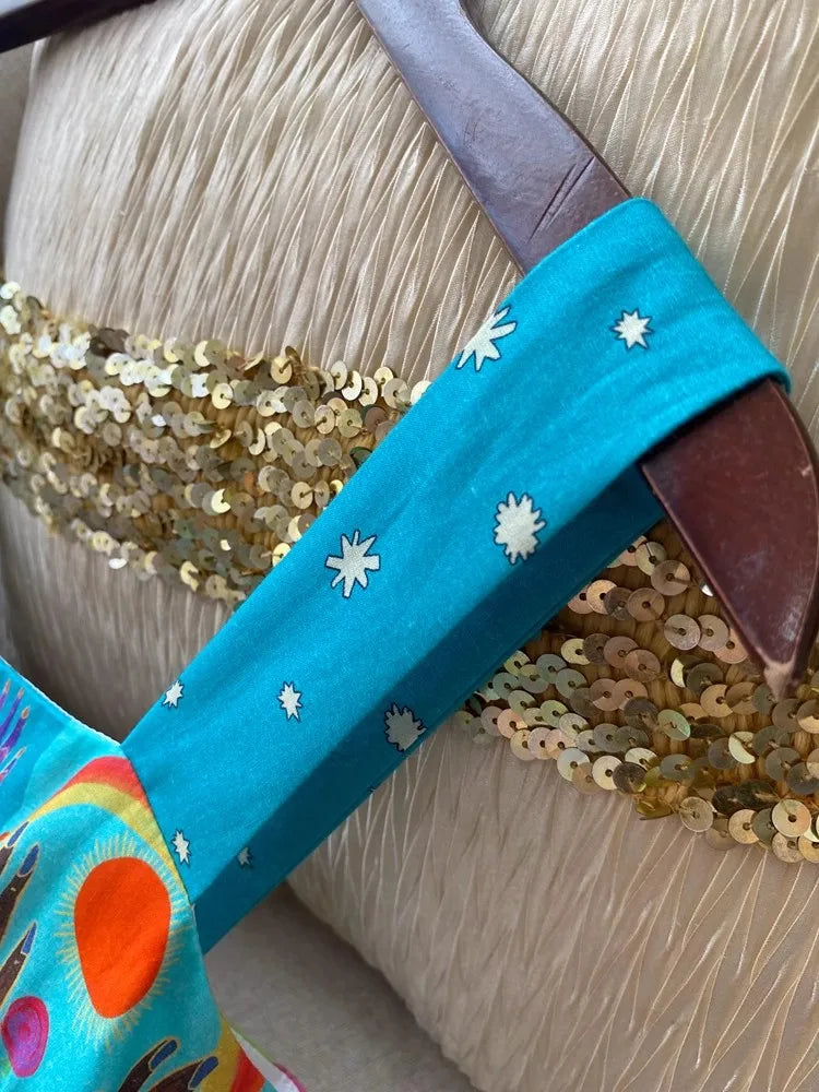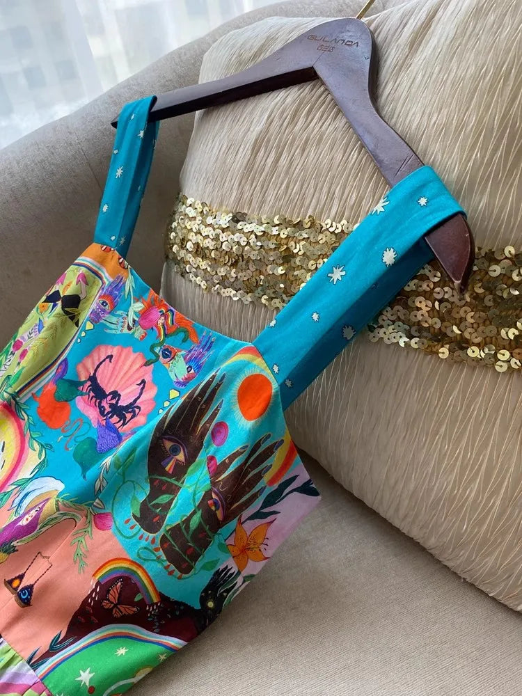 Experience the ultimate festival fashion with our Psychedelic Abstract Ruffled Dress. Featuring a unique blue design with psychedelic elements like hand-eye motifs, scorpions, flowers, snakes, and the sun, this dress is the perfect expression of bold and playful style. The spaghetti straps, tiered cake silhouette, and cascading ruffles add a touch of femininity, while the mid-calf length and A-line silhouette provide a comfortable and flattering fit. Made from a blend of cotton and polyester, this dress is not only eye-catching but also durable. Make a statement at your next festival with our Psychedelic Abstract Ruffled Dress!