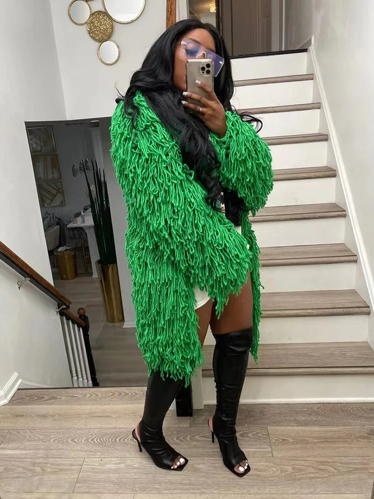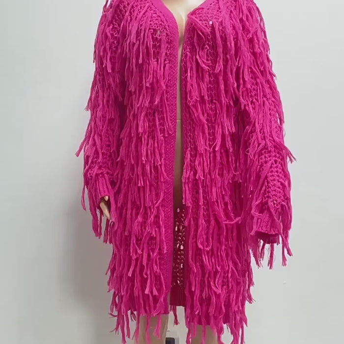 Get ready to turn heads with our fabulous Oversized Tassel Cardigan! Available in a vibrant array of colours including pink, black, brown, red, and green, this statement piece is sure to add a pop of fun to your wardrobe.