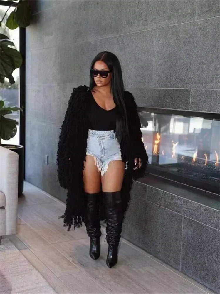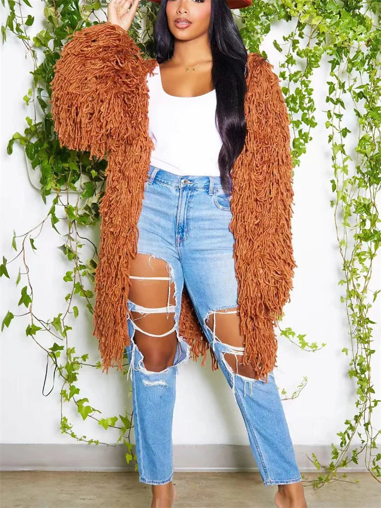Crafted from high-quality polyester, this loose-fitting cardigan falls effortlessly at knee length, offering both comfort and style. Its shaggy, tasselled design exudes a playful vibe, while the slightly stretchy fabric ensures a cosy fit.
