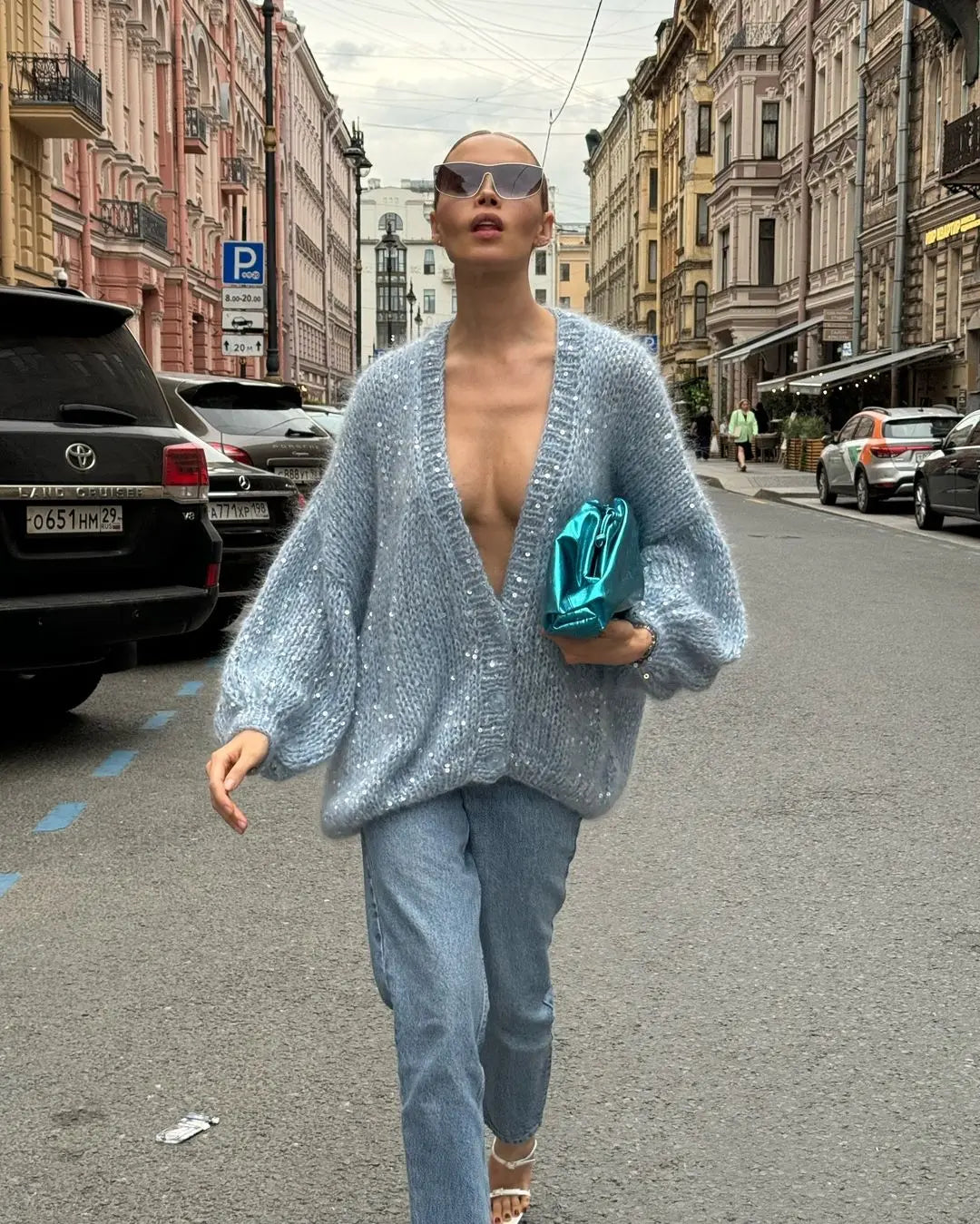Add a touch of sparkle to your festival look with the Sequin Deep V Neck Cardigan in pale blue! This cosy cardigan, crafted from polyester with a mohair-like texture, is as soft as it is stylish. Featuring eye-catching sequins and playful lantern sleeves, it's perfect for layering over your favourite outfits on those chilly nights. The single-breasted design with front buttons and a deep V-neckline gives it a chic, effortless vibe. Fluffy, warm, and irresistibly fun, this knit cardigan will keep you comfy while you party all night long!