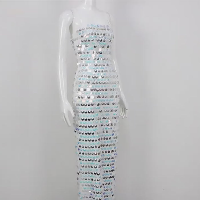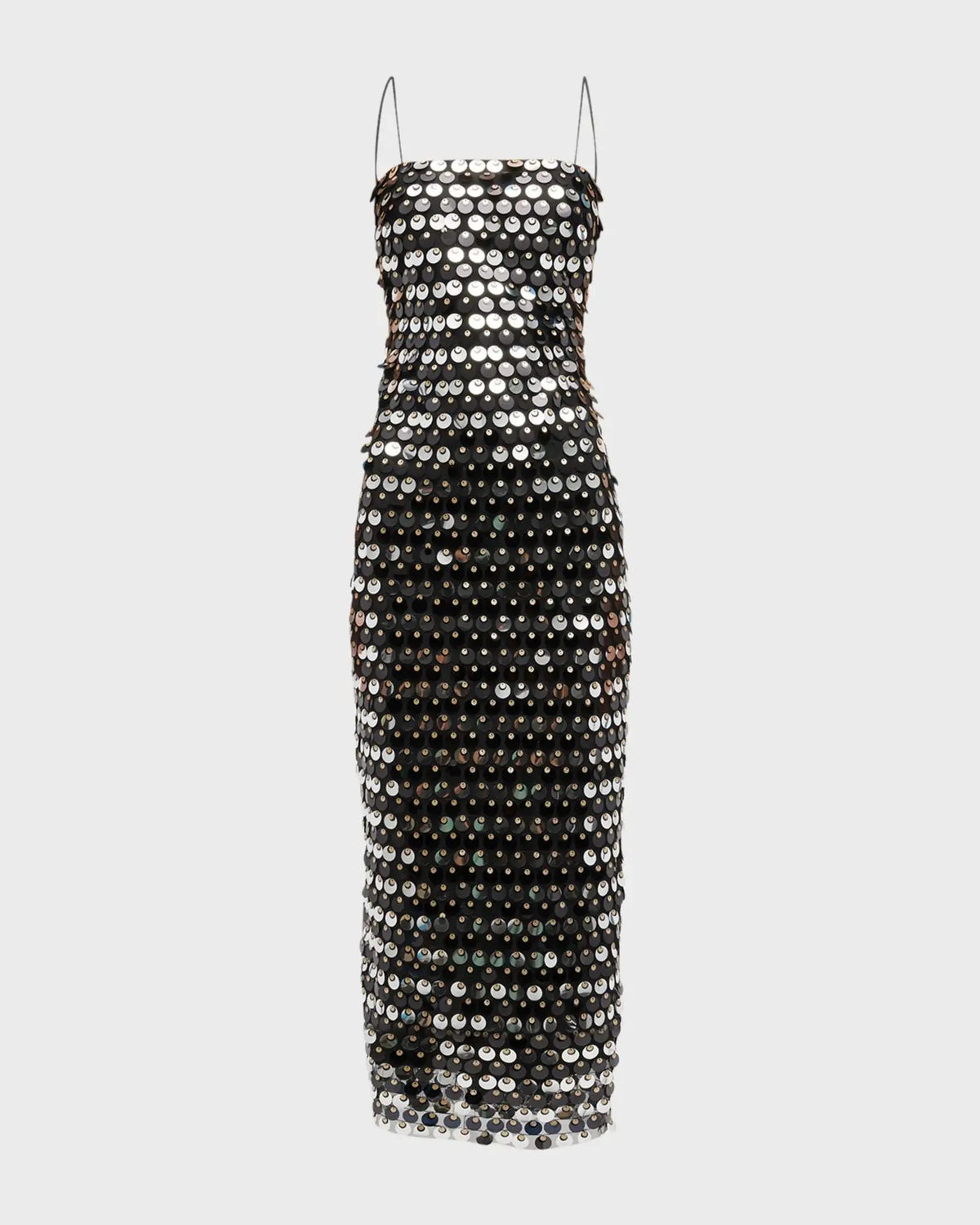 Available in a dazzling range of colours, this dress features spaghetti straps and a chic back split on the bottom half, ensuring you stay cool and comfortable while you dance the night away. The entire dress is embellished with circular holographic sequins, creating a mesmerizing effect that catches the light with every move you make.