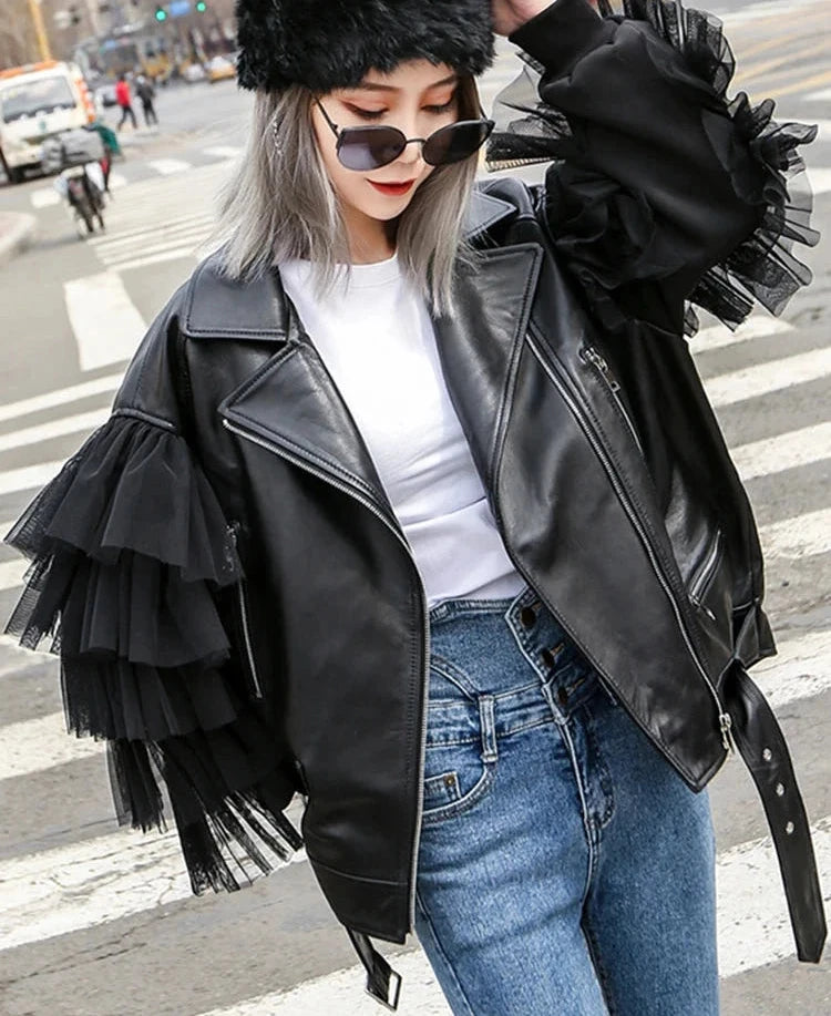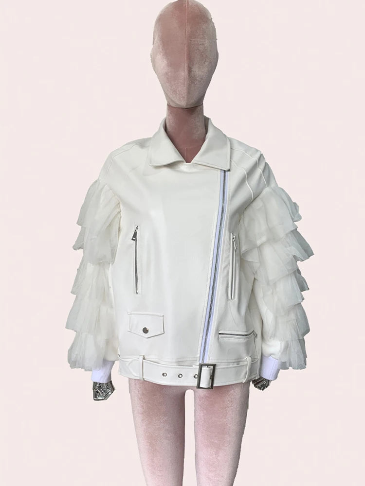 Rev up your wardrobe with our Faux Leather Ruffle Sleeve Jacket! This edgy-meets-elegant piece redefines biker style with a flirty twist. Made from premium PU, it delivers that classic leather look without the upkeep and it's also cruelty free! Choose from black or white, both featuring a turn-down collar, front zipper closure, and a waist-cinching belt, while the front zipper closure and pockets add a touch of functionality. But what truly sets this jacket apart? The gauze ruffle sleeves! Soft, dramatic, and delightfully unexpected, these sleeves bring a playful, feminine twist to the timeless biker look. A perfect and unique jacket to throw over your favourite festival outfit as it can be worn with almost anything!