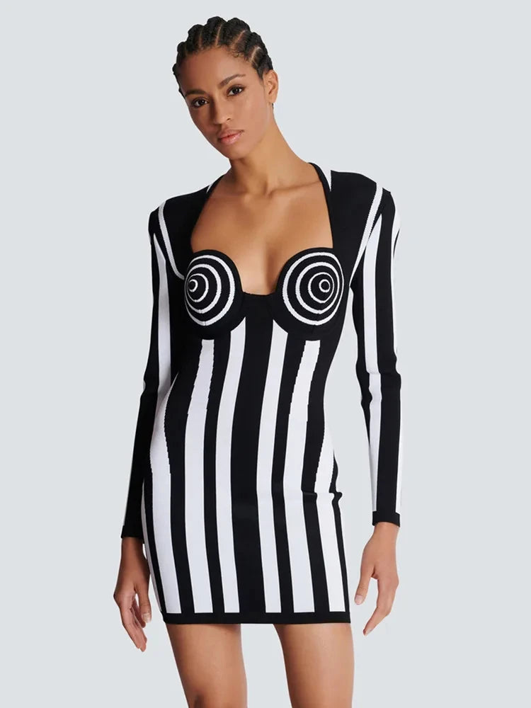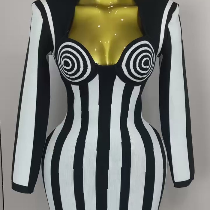 Turn heads in this daring Black and White Striped Bandage Dress, designed for those who love a dramatic edge. Featuring mesmerizing swirls that wrap around the bust in opposite directions, this dress plays with contrast and gives off some serious Beetlejuice vibes! The sharp square neckline adds a dash of retro cool, while vertical stripes elongate and flatter, creating a slim, striking silhouette. Crafted from soft, stretchy polyester that hugs every curve, this bodycon mini dress is all about confidence!