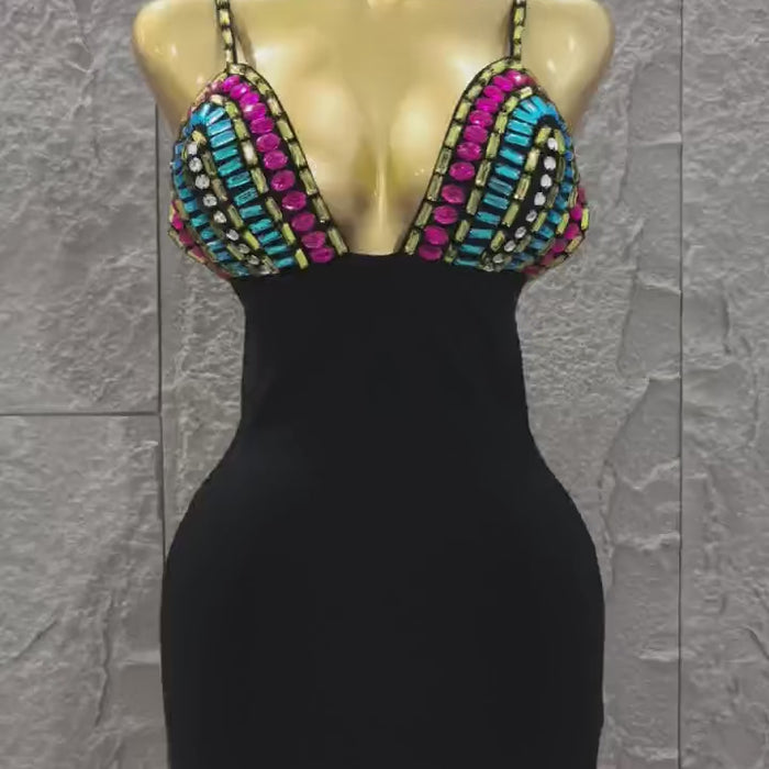 Turn heads in this daring Gem Embellished Bodycon Dress, perfect for festivals and night outs. The black fabric hugs your curves with a sheath silhouette, while multicoloured rainbow gems sparkle boldly on the bust and hem. Featuring a deep V-neck and playful tasselled beads on the trim, this high-quality dress is constructed from polyester and spandex, as seen on Love Island Australia's Sophie Monk. Ready to shine and own the spotlight? This above-knee bodycon is your ultimate statement piece.