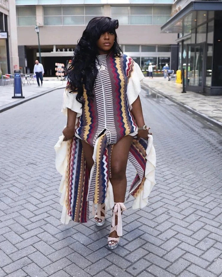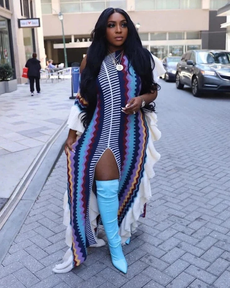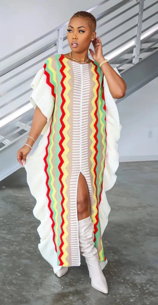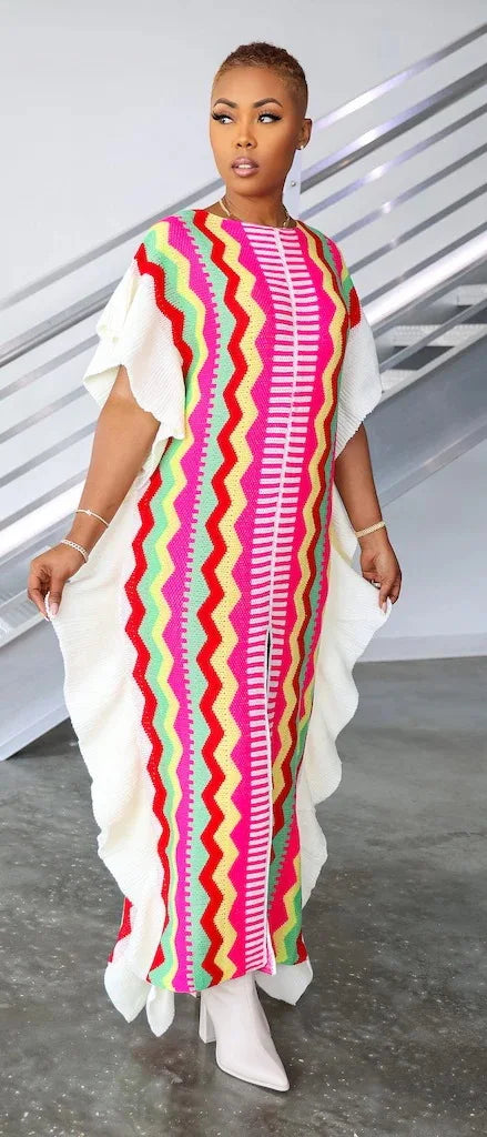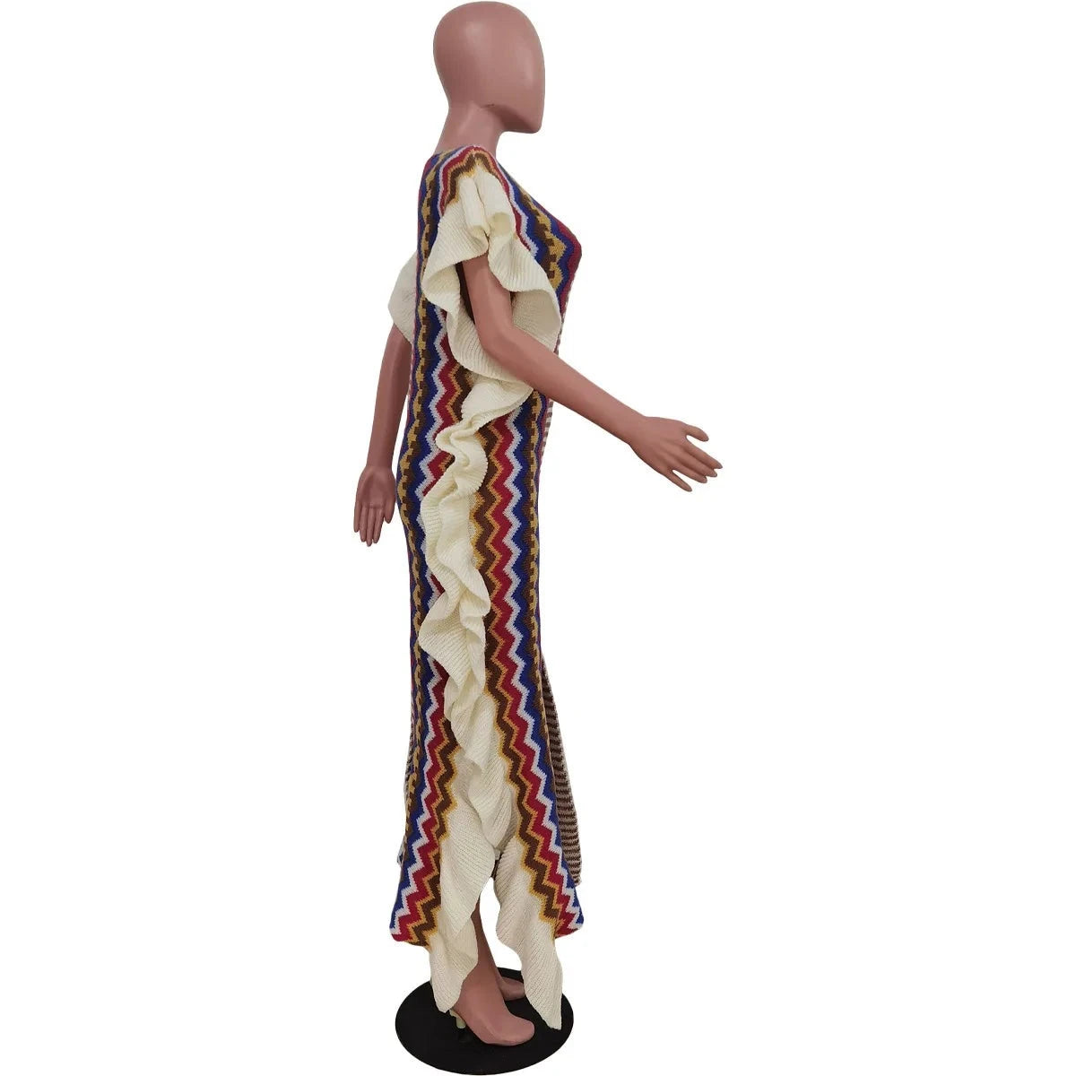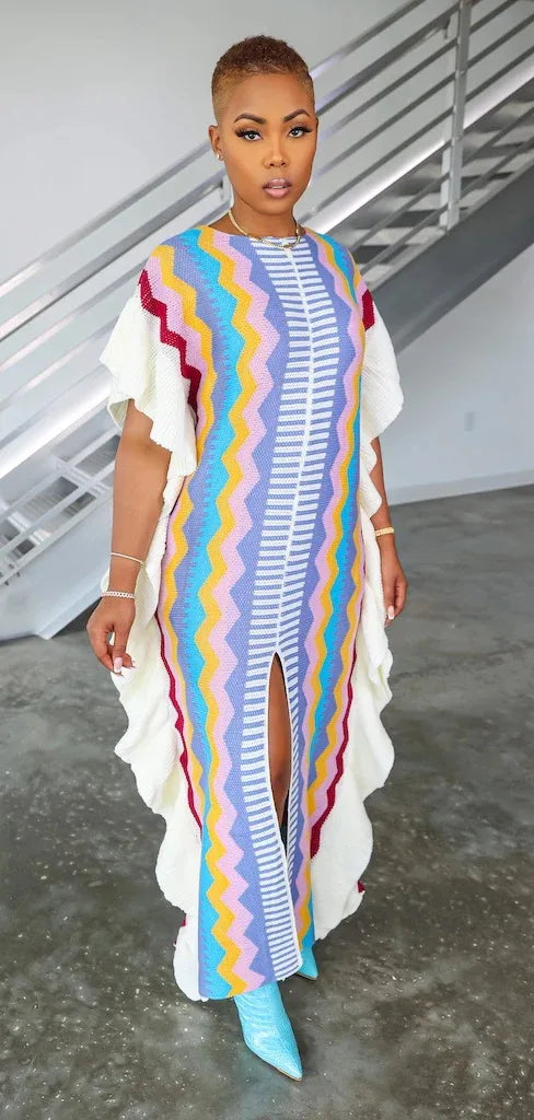 Featuring an eye-catching Aztec vertical print and charming ruffle detailing down the side, this dress exudes bohemian flair with a festival-ready vibe. The front slit adds a touch of allure while maintaining comfort and ease of movement.