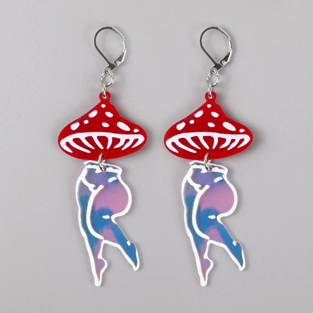 Get festival-ready with these quirky Mushroom Lady Earrings! Available in two bright neon colours, they’re a fun mix of mushroom magic and abstract art. Each earring dangles with a mushroom cap on top, transforming into a woman's waist and legs below—perfect for making a statement! Made from lightweight acrylic with zinc alloy hooks, they’re comfy enough to dance in all night long.