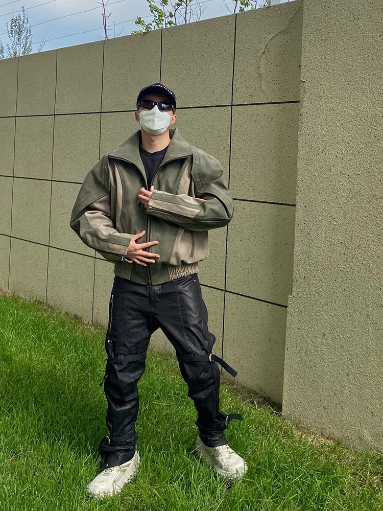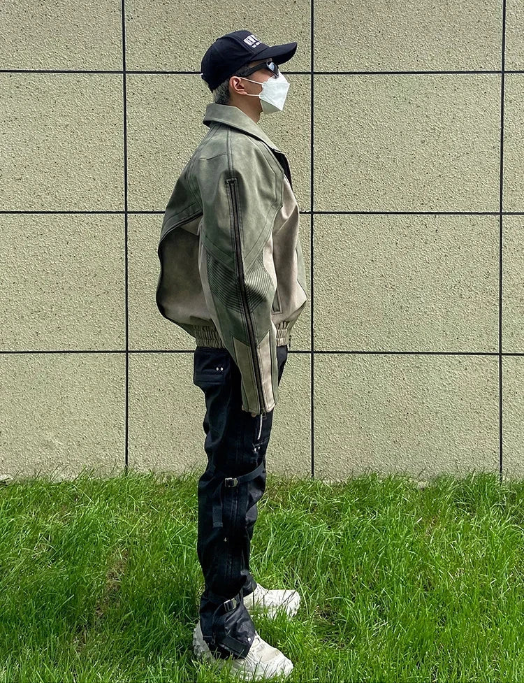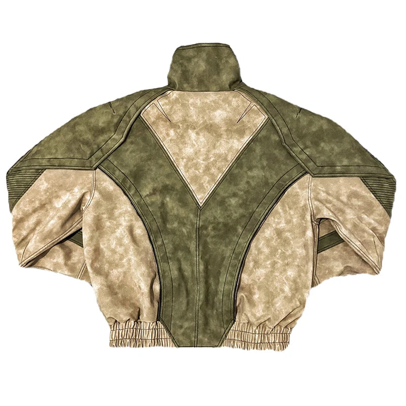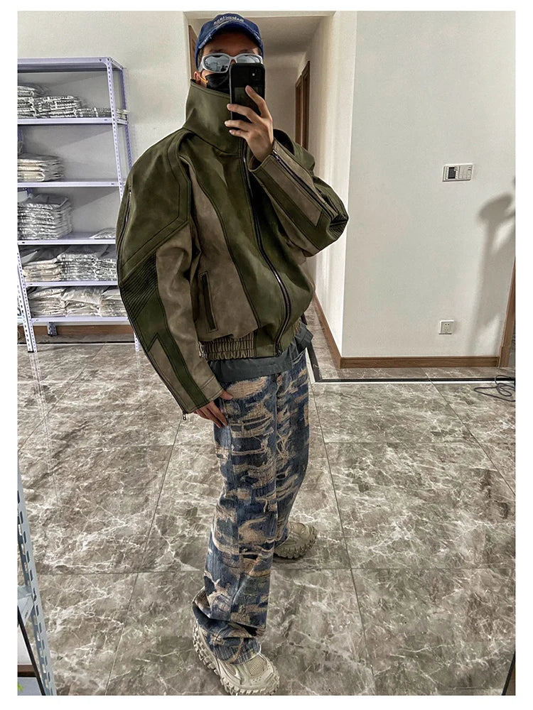 Maximize your style and comfort with our Men's Faux Leather Patchwork Jacket. Made from PU, this jacket is waterproof and perfect for any outdoor festival. Featuring a front zipper closure and front pockets, this jacket has an oversized fit and a unique green and beige patchwork distressed design. With the option to wear it as a zipped up turtleneck or with a turned down collar, you'll be ready for any weather your next festival throws at you!