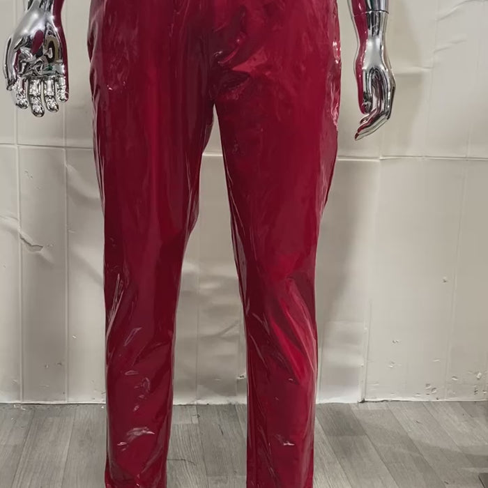 Effortlessly elevate your style with these Men's Faux Leather Red Trousers. This pair of skinny, straight leg pants is made from high quality faux leather and features a fly zipper closure for added convenience. Perfect for any rockstar or festival goer, these trousers offer a shiny patent aesthetic and are designed with bright red colour to make you stand out. Plus, with front pockets, you can easily keep your essentials close at hand while looking your best.