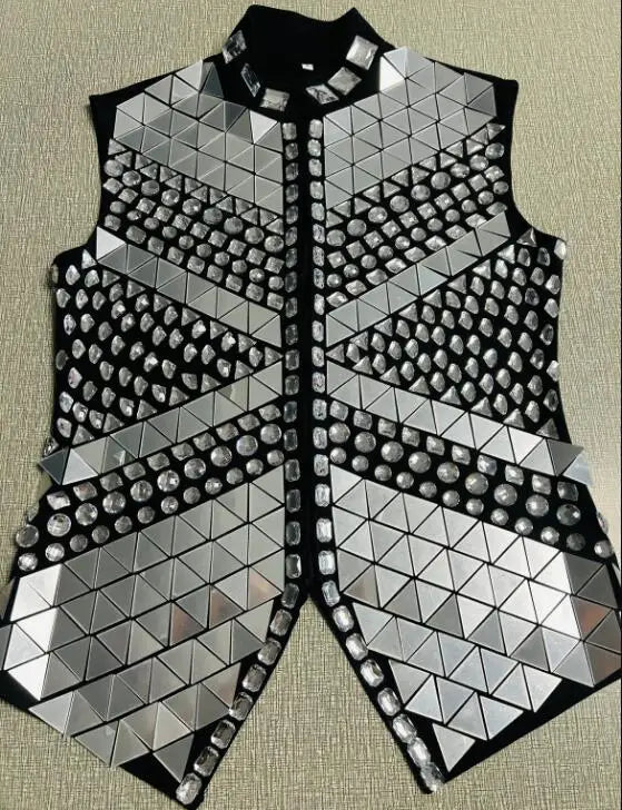 Featuring holographic laser cut segments and rhinestones embellished across the front, this vest catches the light and creates a mesmerizing effect. The rhinestones form an array of shapes, including squares, circles, and triangles, giving you a dynamic, mirrored look that's sure to turn heads.