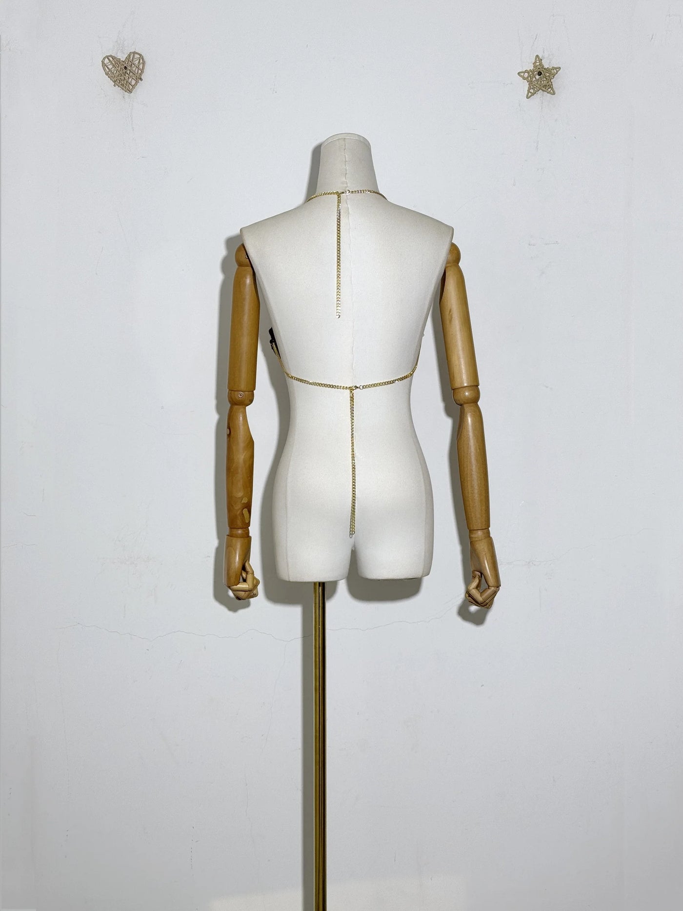 Fastened securely around the neck and back with a lobster clasp, this dreamy crop top features glimmering chains, magical shells, sparkling beads, and ocean-kissed stones that cascade like treasures below the bust. The shoulder straps? Yep—decorated with dainty bead accents for that extra shimmer.