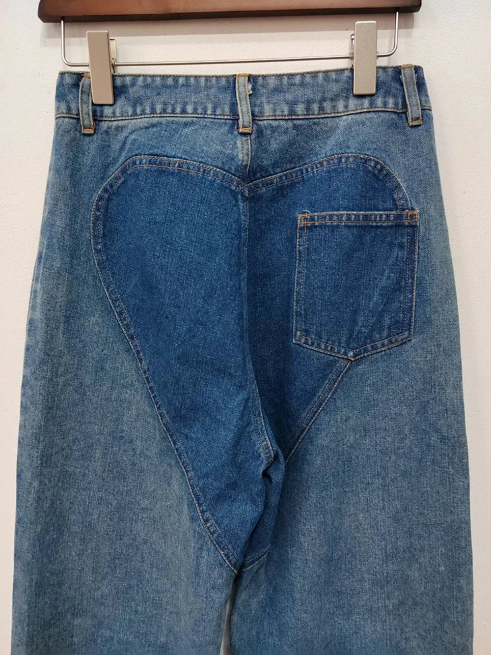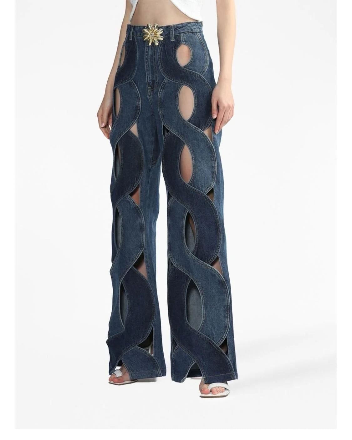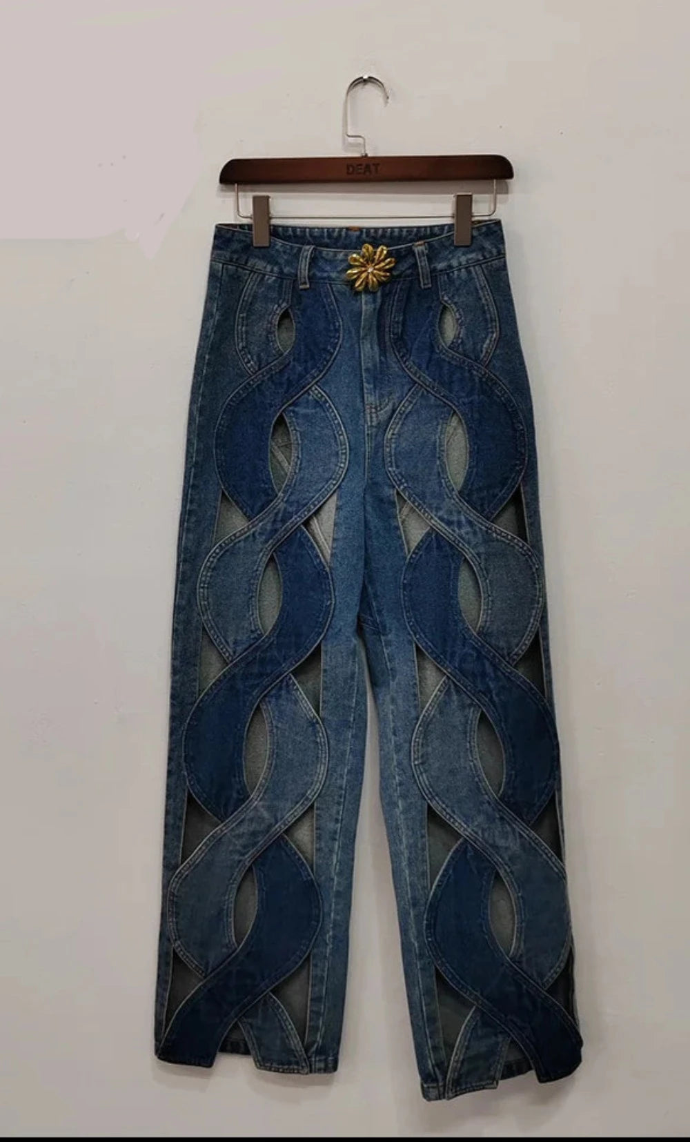 Write a very simple but fun product description about Zig Zag Denim Jeans, hollow out design, gold flower belt, fly zipper closure, denim, jeans are a contrasting dark blue and light blue colour that cross over to form the hollow out design, high waisted, festival, sexy, made from cotton and polyester, straight leg