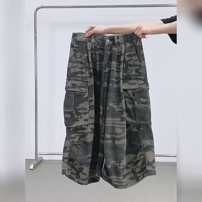 Pair a bold, nostalgic print with modern comfort and functionality with Camo Cropped Capri Trousers. These calf length trousers feature a cool camouflage print inspired by Avril Lavigne's Y2K sk8er boi era, and are crafted from a durable denim blend of cotton and polyester. With a button and zipper closure, wide leg design, and convenient pockets for storing your essentials, these cargo trousers are perfect for any festival or outdoor adventure.