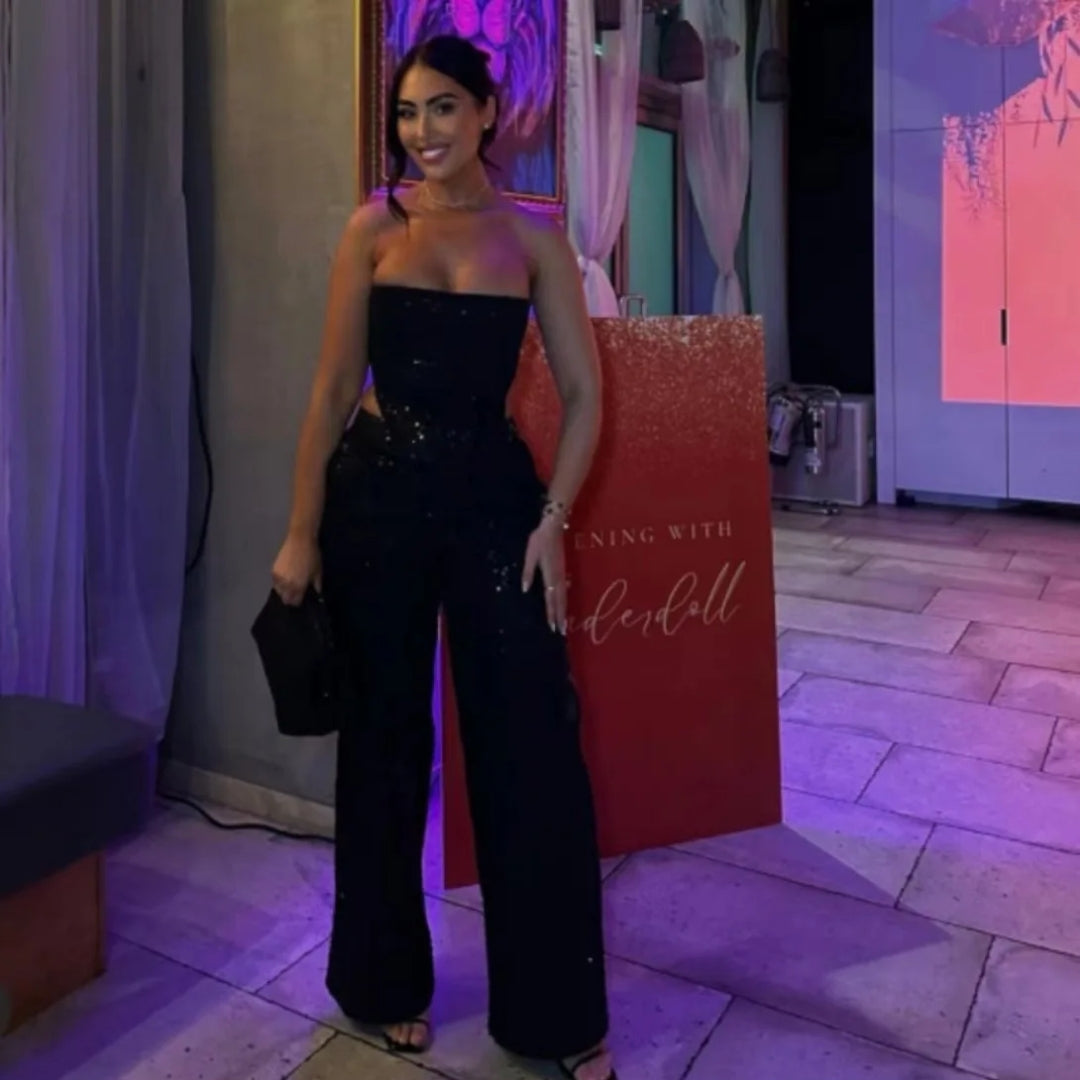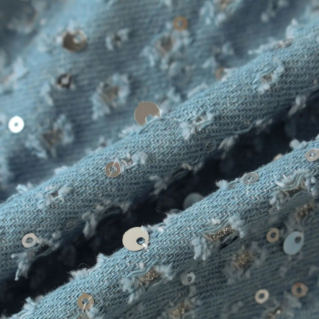Step into the spotlight with our Sequin Denim Corset and Pants Two-Piece Set, available in striking baby blue or classic black. This celeb-inspired ensemble is your ultimate go-to for festivals and unforgettable nights out.