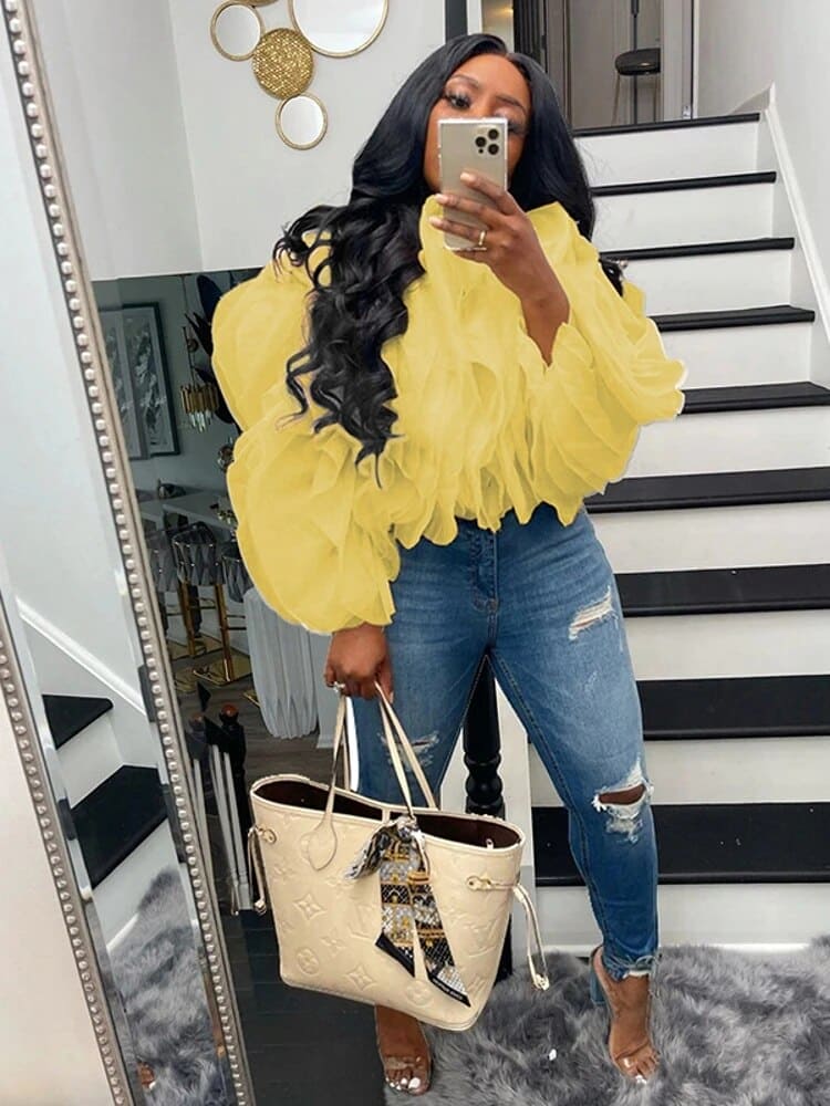 The fashionable and flattering design of this blouse is a definite attention-grabber. The lightweight chiffon fabric makes this feminine top a great, bold fashion choice for a Festival. Post-festival time, this lovely top is an absolute choice for a cocktail party or an evening out on the town.