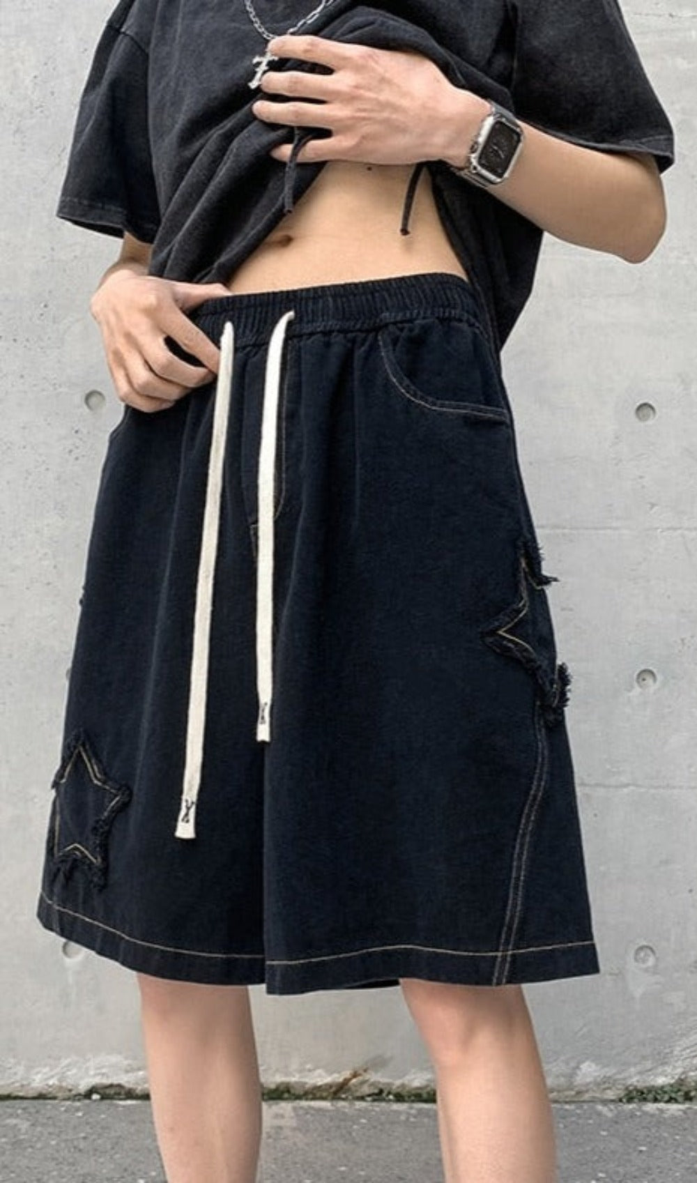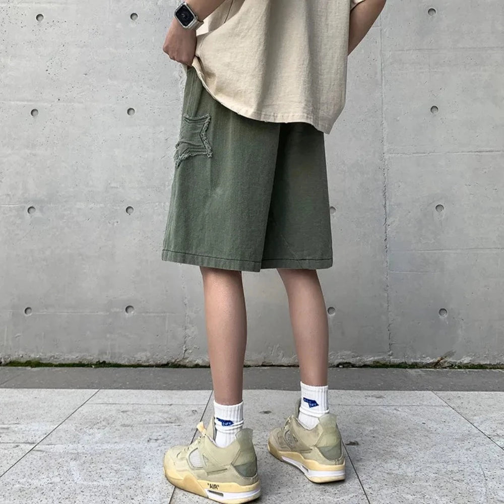 Introducing our Star Patchwork Shorts - designed for men - but in essence, are unisex!  The ultimate summer festival fashion statement! Available in your choice of sleek black or rugged army green, these knee-length shorts with an elastic waist are crafted with the perfect blend of cotton and polyester to ensure comfort, durability, and style all in one.