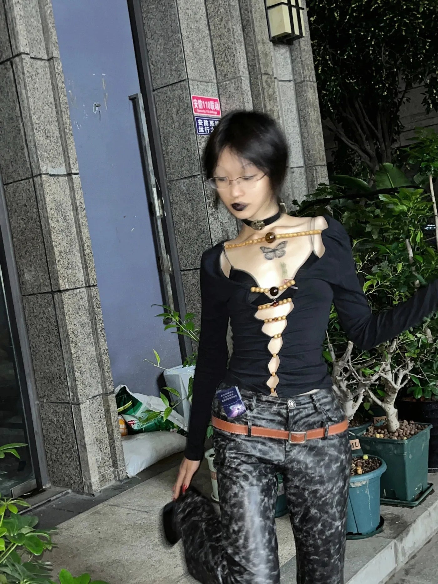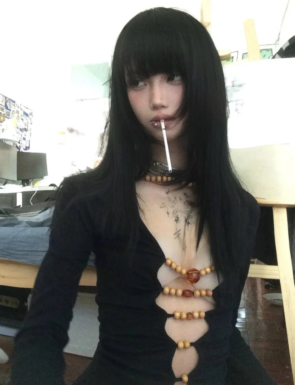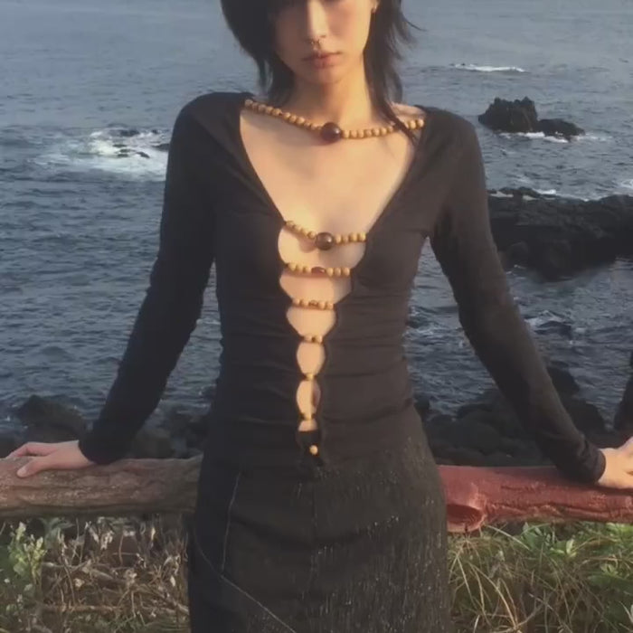 Prepare for festival season with our Beaded Hollow Out Long Sleeve Top. Made from soft and stretchy cotton, this boho-chic top offers both comfort and style. With wooden beaded straps and a bold gold bead at the centre, its deep V-neck and Y2K-inspired design are not only flattering but also eye-catching.
