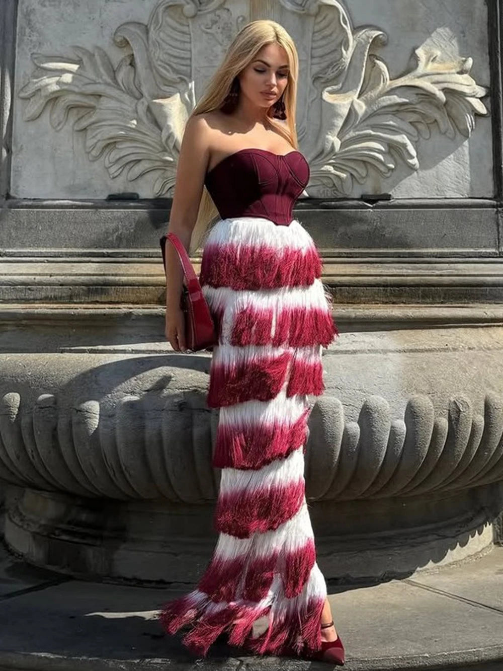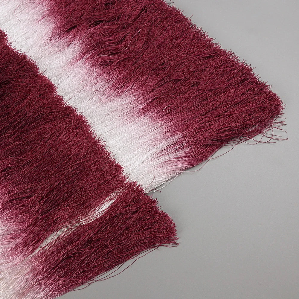 The Gradient Top & Tassel Skirt Set is a refined choice for those seeking stylish summer and festival wear. The set includes a corset-style, strapless bustier top with boning for support, padded cups for comfort, and a discreet zipper closure that ensures a secure fit. Slightly cropped, the top complements the ankle-length skirt, which sits gracefully on the hips. The skirt’s standout feature is its elegant wine red to white gradient, accented by playful tassels that add subtle movement and texture. Crafted from a premium blend of polyester and spandex, this high-quality ensemble offers both durability and stretch, making it ideal for warm-weather events and holidays.