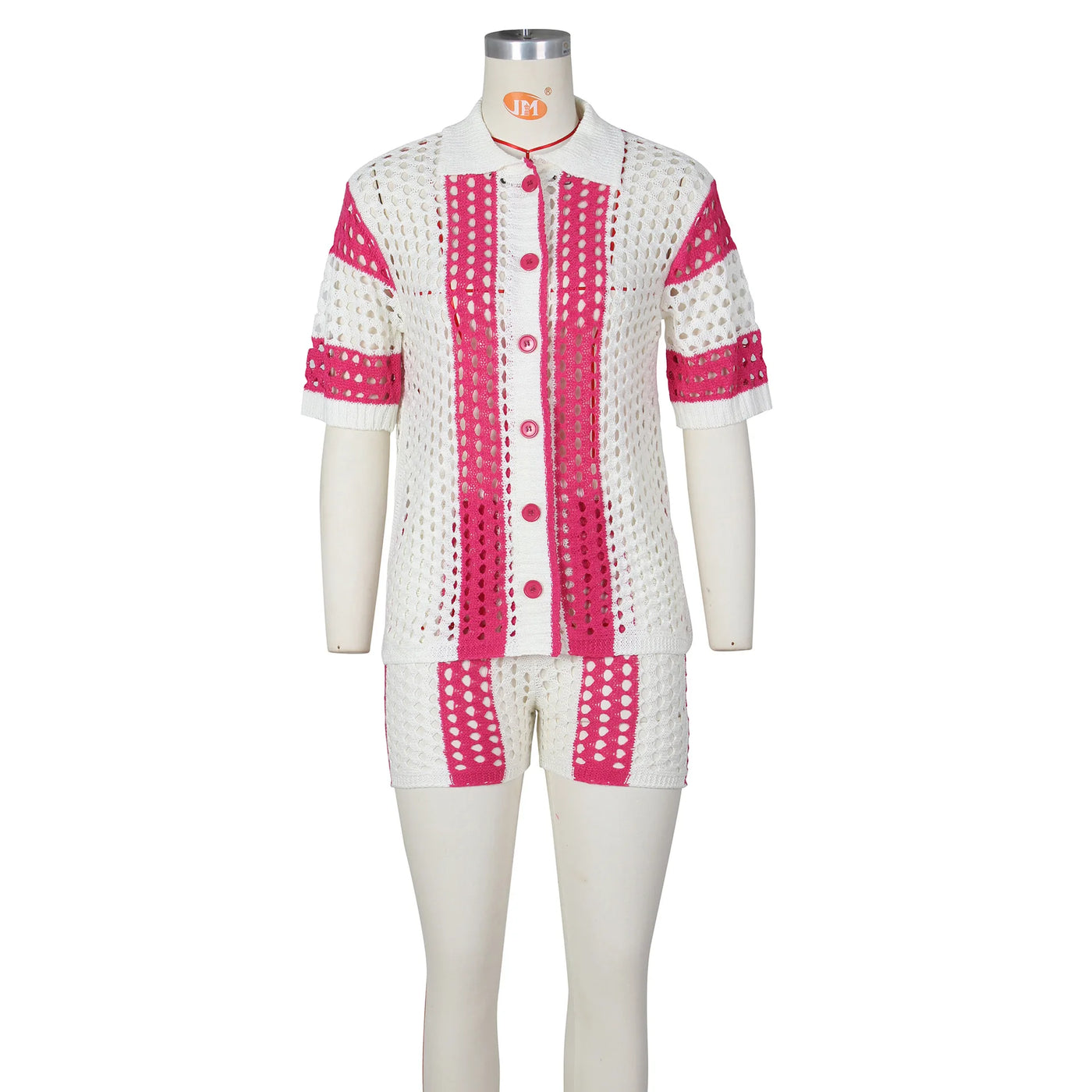 Meet your new favourite festival outfit! Our Striped Hollow Out Two-Piece Set includes a cute button-up top with a turn-down collar and matching shorts. Made from soft, slightly stretchy acrylic, this knitted set features a fun hollowed-out design and bold vertical stripes.