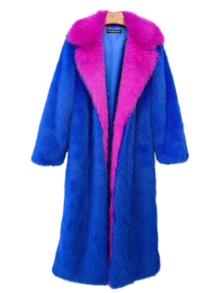 Stay cosy and stand out with this Blue and Pink Contrast Long Faux Fur Coat! With a bold magenta lapel that pops against the navy blue fur, this long, soft, and warm coat is perfect for festivals or chilly adventures. It features a turn-down collar, hook-and-eye closures, and thick faux fur for ultimate comfort and style. Long sleeves and a fun, vibrant vibe make it a must-have for staying festival fabulous in the cooler evening temperatures.