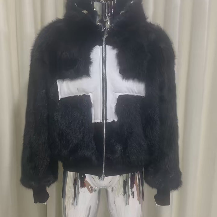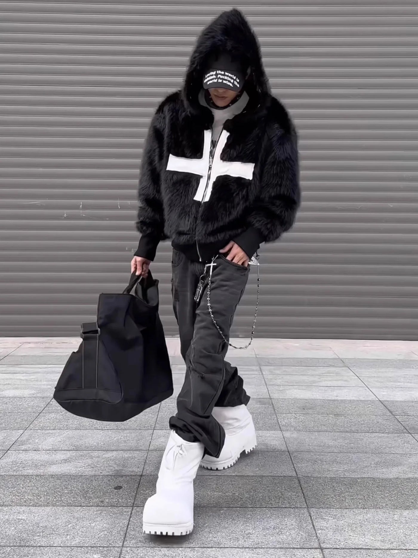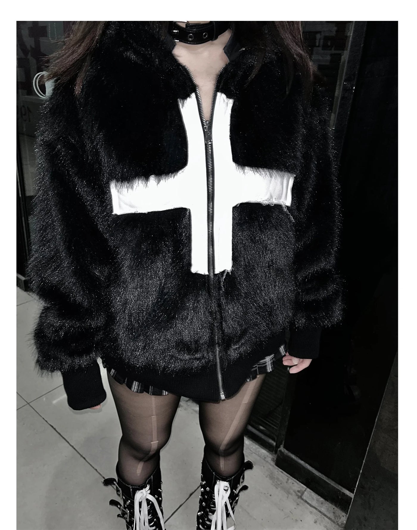 Bring the rock vibes wherever you go with our Men’s Faux Fur Cross Jacket — bold, warm, and full of attitude. Made from high-quality polyester faux fur, this thick, wide-waisted jacket features a zipper closure, rivets around the hood trim, and a striking white distressed cross that pops against the black fur.