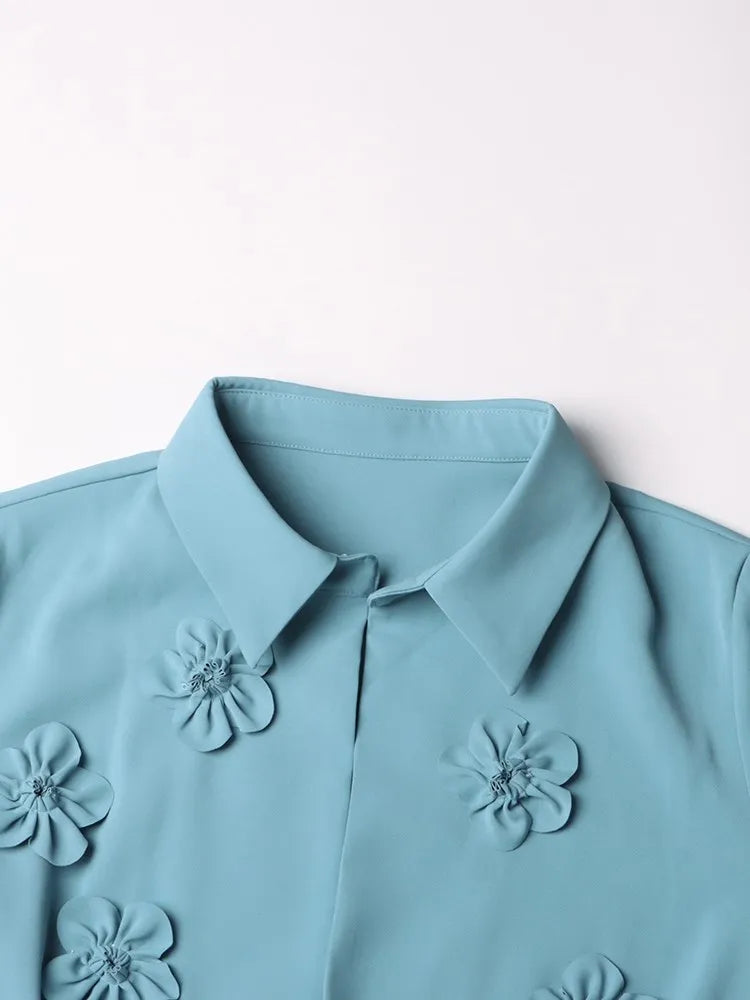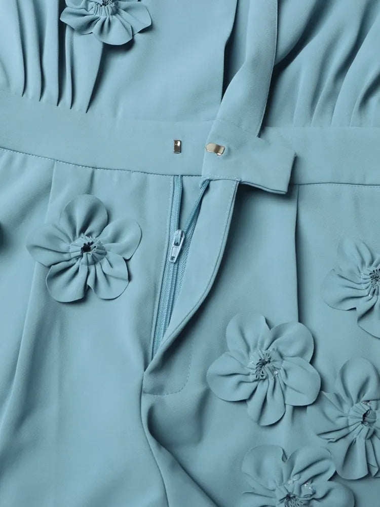 The 3D Floral Playsuit, available in blue or pink, showcases applique 3D flowers across the front for a stylish boho look. It features a turn-down collar, V-neck, and a waist belt to accentuate your figure. Made from a polyester and cotton blend, it includes a zipper closure on the shorts and snap buttons on the shirt.