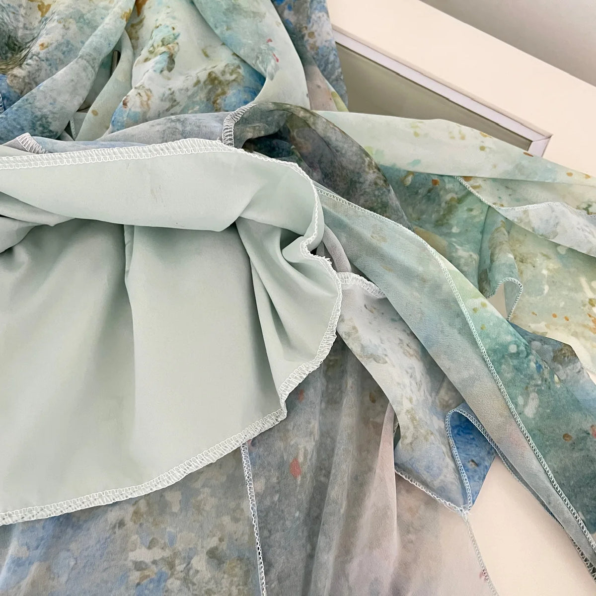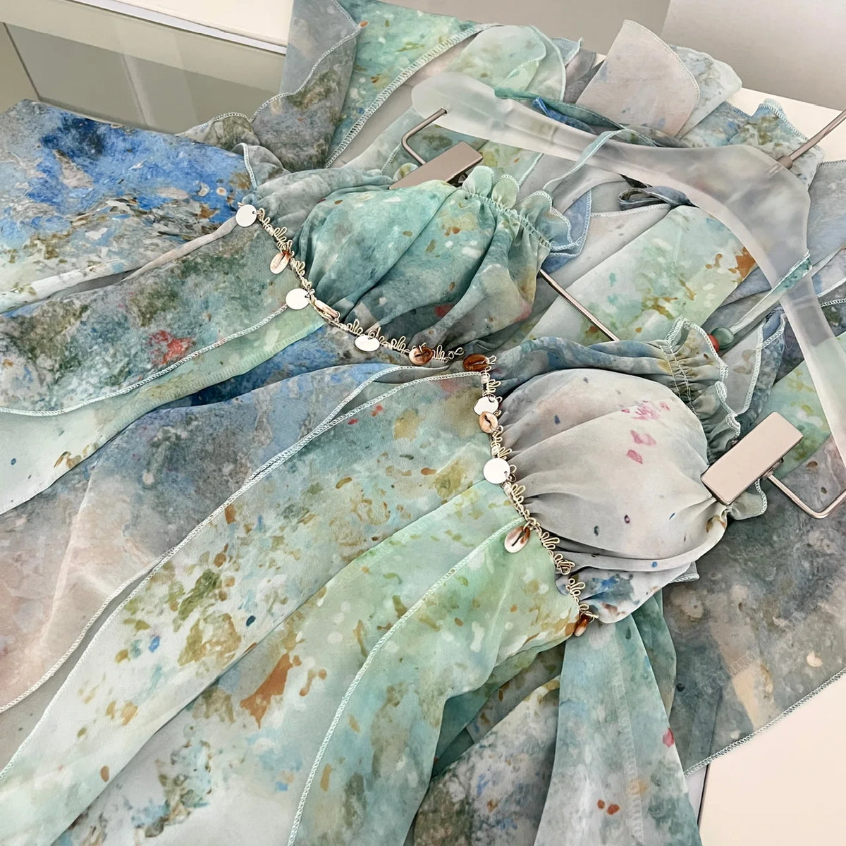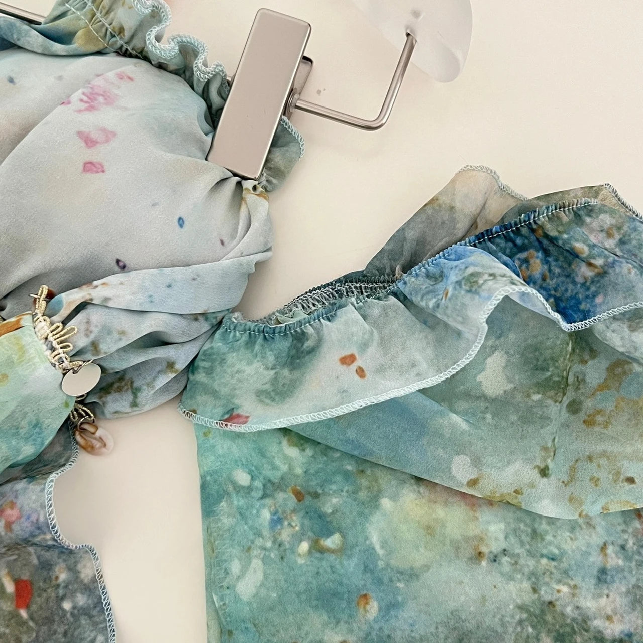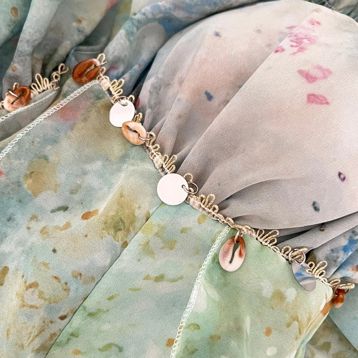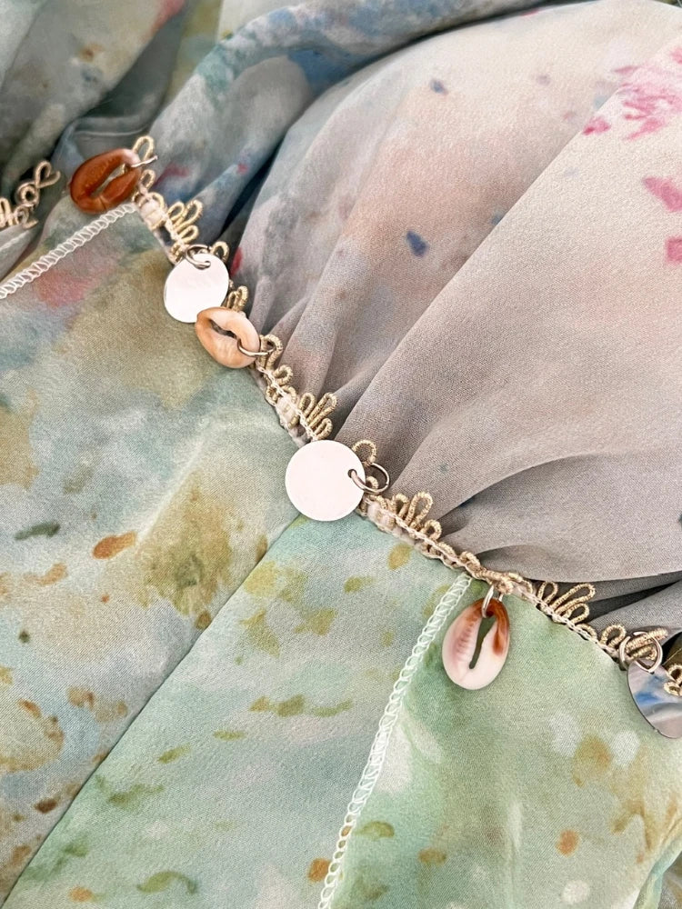 The ankle-length skirt flows beautifully with an elegant ruffle design, while the elasticated waist keeps it comfortable all day. Ocean-inspired blue, green, and white hues bring dreamy seaside vibes, and the cowrie shells with metallic circular appliqués under the bust add a playful beachy touch.