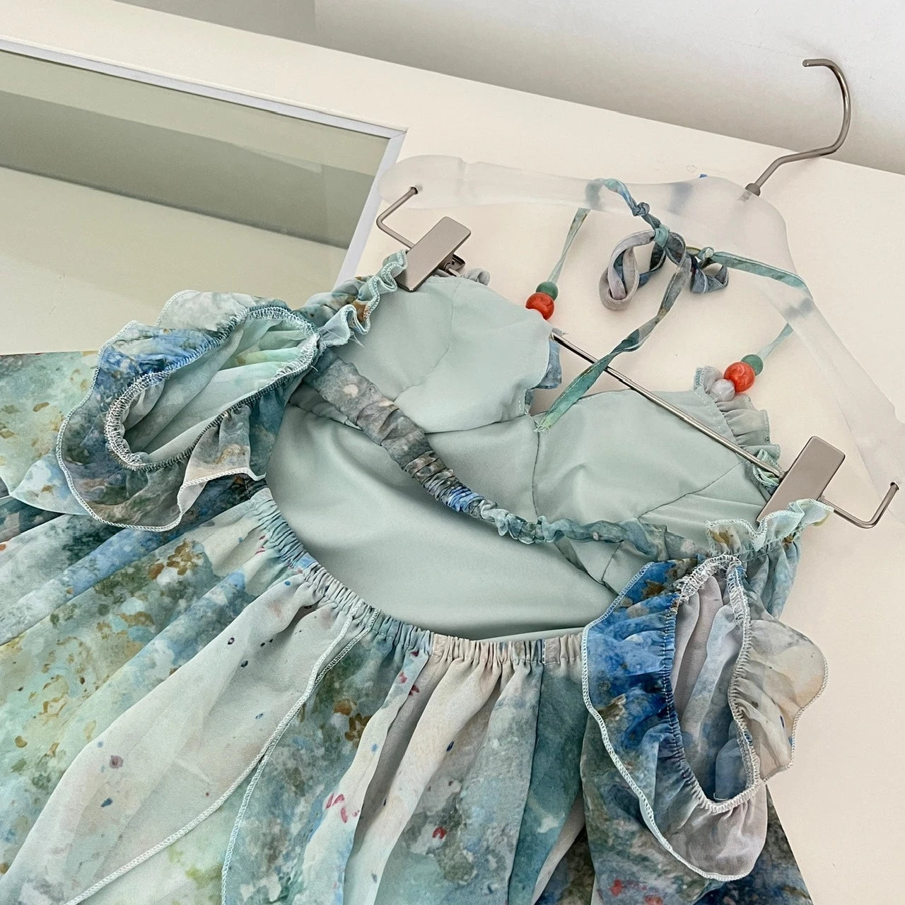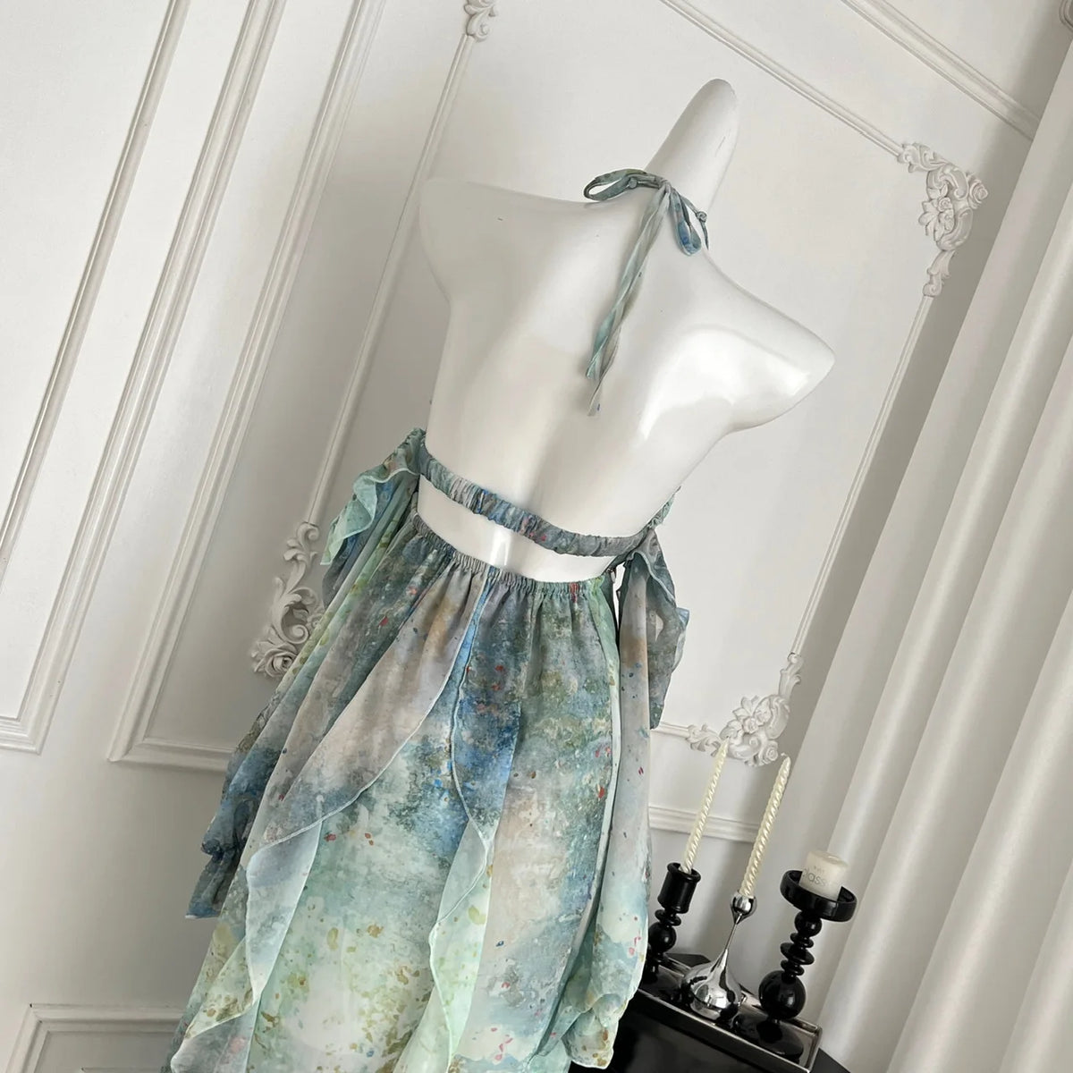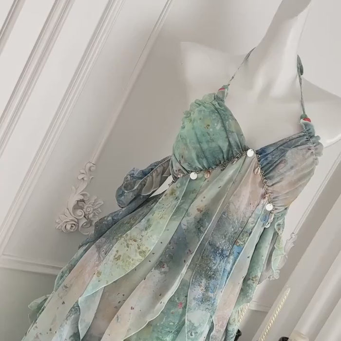 This Floral Ruffle Maxi Dress is made for sunshine, music, and salty ocean air. Designed with a flattering V-neck, spaghetti straps, and a backless halterneck tie, it feels light, breezy, and effortlessly stylish.